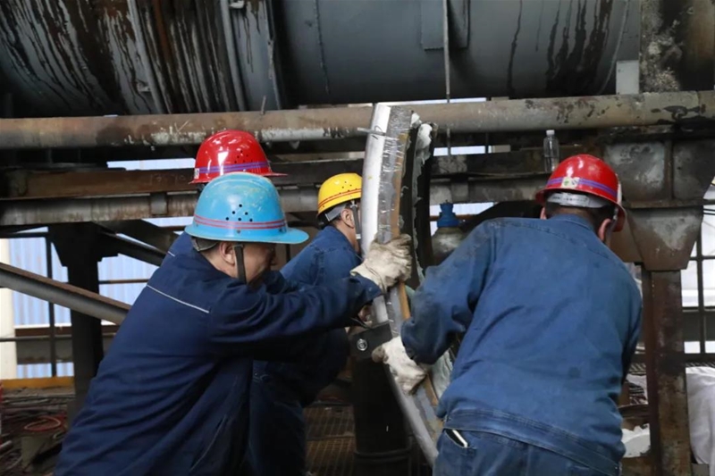 “來,再來兩個人,抬一下膨脹節(jié)……”有人艱難地拉動備件,有人趕來幫忙,嘴里還喊著人員支援。話音未落,不遠(yuǎn)處外協(xié)工隊的工人們都跑了過來,齊心協(xié)力把膨脹節(jié)搬抬至指定位置。“小劉,廢舊的保溫磚一定要清理干凈!”“王師,管道焊接一定要高質(zhì)量!”“收到,一定保障新保溫磚鋪好……”