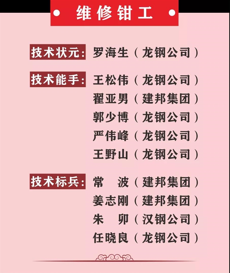 薛繼虎宣布表彰決定。本次競賽,來自陜西省機(jī)械冶金建材系統(tǒng)11家參賽單位以及西北聯(lián)鋼3家山西鋼鐵企業(yè)的137名參賽選手,經(jīng)過3天的激烈角逐,最終在高爐煉鐵工、冶金天車工、分析化驗(yàn)工、維修鉗工4個(gè)工種競賽中產(chǎn)生了陜西省機(jī)冶建材系統(tǒng)“技術(shù)狀元”4名、“技術(shù)能手”20名、 “技術(shù)標(biāo)兵”16名,其中分析化驗(yàn)工和冶金天車工兩個(gè)工種競賽還產(chǎn)生了“優(yōu)秀獎(jiǎng)”15名,并在閉幕式進(jìn)行表彰頒獎(jiǎng),還表彰了優(yōu)秀組織單位和優(yōu)秀組織個(gè)人。對(duì)獲得本次大賽高爐煉鐵工、冶金天車工前3名的選手將由組委會(huì)推薦省有關(guān)單位授予“陜西省技術(shù)能手”稱號(hào)。