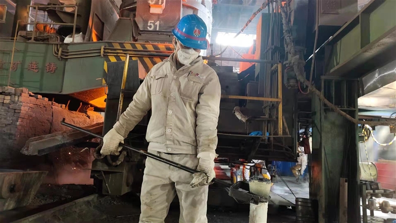 為確保鑄坯質(zhì)量,每隔五個小時需要進行一次換套管。張光輝穿著防護服,手拿拖圈直奔三流。中包工王曉輝精心關注著三流鋼水,配合張光輝完成更換套管工作。小強協(xié)助壓著配重,張光輝迅速將拖圈套入套管,并將套管卸下放置到廢鋼斗內(nèi)。這只是他們工作的其中一項,但不管是白天還是黑夜,他們始終以飽滿的工作熱情去完成每一次任務。
