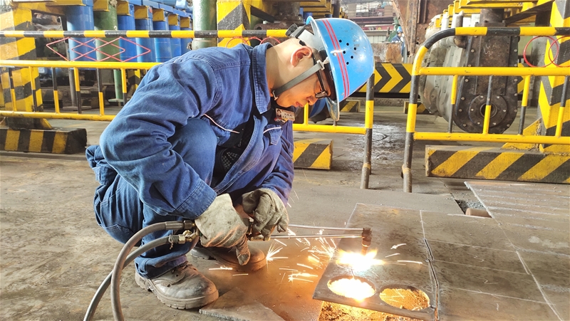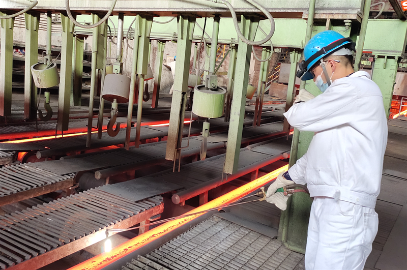 在4#連鑄機(jī)臺(tái)下,兩名拉矯剪切工正在輥道旁切割三流的連角,切割人員一手拿著割槍,一手半遮住面部,在鋼坯的炙烤下他們額頭上滲出汗水,但他們卻沒有一絲動(dòng)搖,依然雙目不移,緊緊握著割槍切割,認(rèn)真而謹(jǐn)慎,在火花飛濺中快速且標(biāo)準(zhǔn)地將連角切斷,只為確保割縫在標(biāo)準(zhǔn)范圍內(nèi),降低消耗。剛切割完鑄坯的他們顧不上額頭上的汗水,走向定尺桿的位置,抬起定尺桿,三步并作兩步跨越輥道,對溫度最高的中間流紅坯進(jìn)行長度測量,動(dòng)作統(tǒng)一、干脆利落。為了保證鑄坯的定尺合格率達(dá)到100%,像這樣的場景一班下來需要重復(fù)五六次,但,他們卻沒有任何怨言,默默堅(jiān)守在自己的崗位,為降本增效做出自己的貢獻(xiàn)。