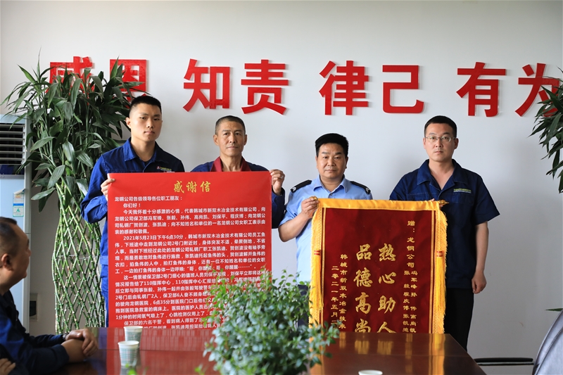 5月27日,同興公司協(xié)作單位韓城市新雙木冶金技術(shù)有限公司負(fù)責(zé)人,將一面寫(xiě)有“熱心助人 品德高尚”的錦旗以及一封感謝信送到公司,對(duì)公司軋鋼廠職工賀創(chuàng)波等三人和保衛(wèi)部職工馮軍鋒等六人表示感謝,感謝他們?cè)陉P(guān)鍵時(shí)刻見(jiàn)義勇為,對(duì)外協(xié)單位職工魚(yú)偉施以援手的救命之恩和感激之情。