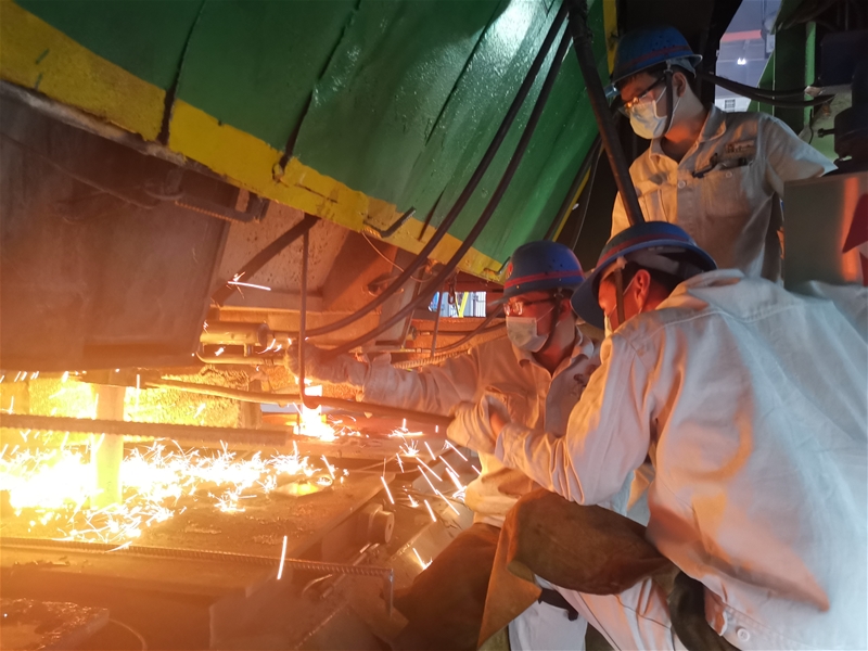 在5#連鑄機(jī)平臺(tái),中包工正忙著快速換包。快速更換中間包是連鑄生產(chǎn)過程中一項(xiàng)十分重要的工藝,七、八分鐘的搶奪戰(zhàn),每一秒都要全力以赴精準(zhǔn)操作。在班長的指揮下,全員按照既定步驟一步一步進(jìn)行操作,卸套管、堵流、將下線中包車開走、將新上線中間包開到對(duì)中位置校正后、大包開澆……