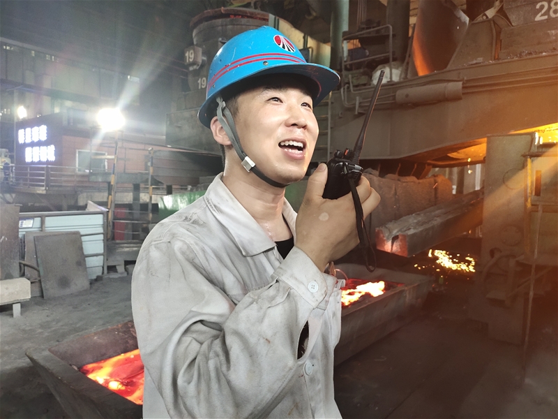 圖一:煉鋼廠連一作業(yè)區(qū)3#連鑄機丙班班長王昆正在指揮天車進(jìn)行吊運作業(yè),盡管背后有炙熱的紅渣,但為了站在指揮天車的最佳位置,他紋絲不動。掛滿汗水的笑臉考驗著這位鋼鐵男兒的執(zhí)著與夢想。
