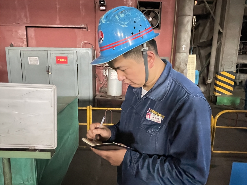圖九:煉鋼廠天車作業(yè)區(qū)天車工李鋒博在記錄設(shè)備運行情況,他所在的出坯垮地面全是1000℃的紅坯,熱量持續(xù)往上方擴(kuò)散,臉上的汗珠往下滑落,不變的是他對設(shè)備的認(rèn)真負(fù)責(zé)。