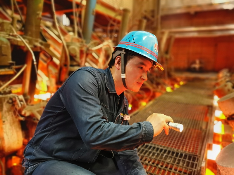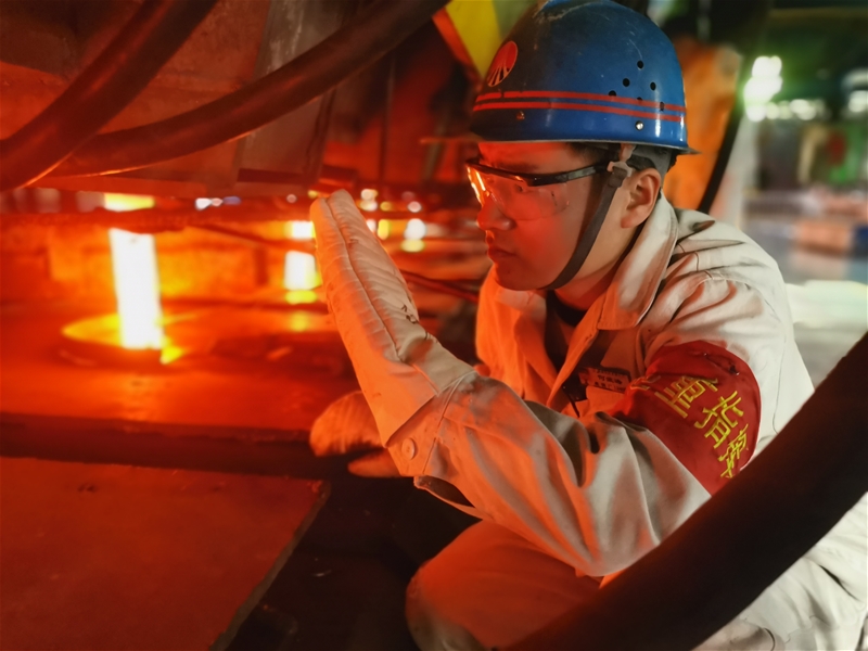 圖二:煉鋼廠連二作業(yè)區(qū)安檢員郭云峰正在對拉矯系統(tǒng)進(jìn)行檢查,火紅的鋼坯從他的腳邊緩緩穿過,盡管他全身被烤得微疼,但他的眼睛始終聚焦在運轉(zhuǎn)的設(shè)備上,不敢有一絲懈怠。