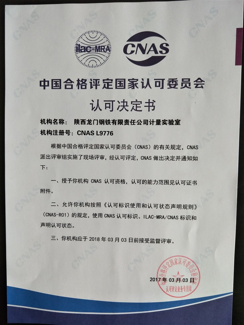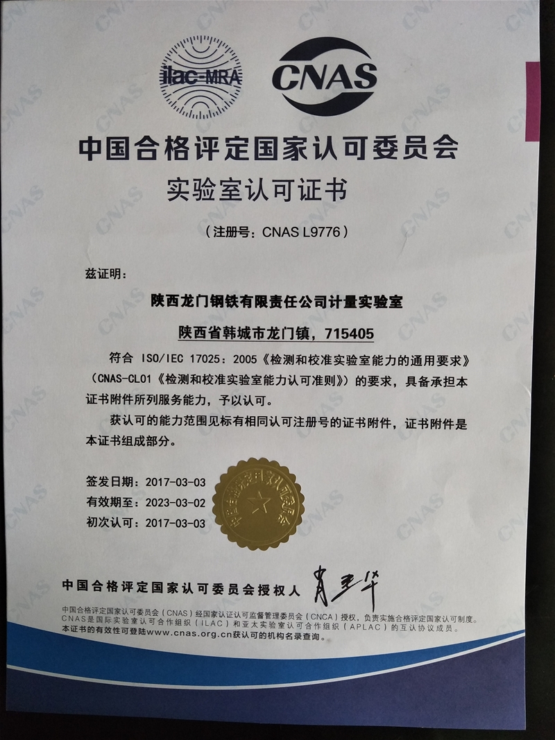 陜西龍門鋼鐵有限責任公司計量實驗室具有25年測量設(shè)備校檢歷史,具有公司力學(xué)、熱工、長度、電磁、理化五大類18項最高計量標準, 208臺(套)計量標準器具,實驗室具有獨立校檢面積360平方米,下設(shè)熱工檢定室、壓力檢定室、高溫檢定室、長度檢定室、容器檢定室、電磁檢定室、氣體檢定室、質(zhì)量檢定室等多個專業(yè)檢定室,具有年校檢測量儀器設(shè)備2萬臺的能力.
