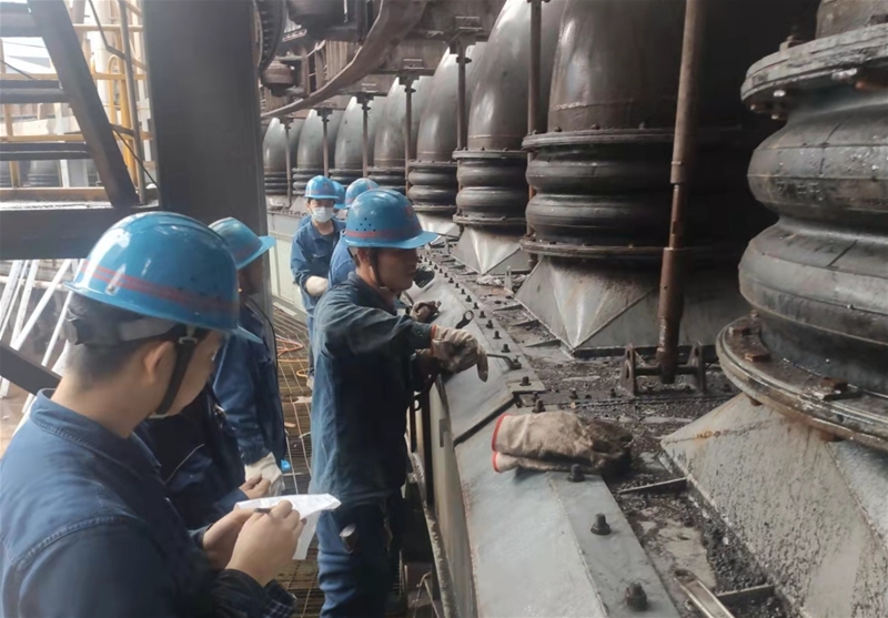 圖二:高爐崗位職工在對爐頂?shù)臍饷芟、儀表儀器等關(guān)鍵生產(chǎn)設(shè)備進行檢查,做好精密儀器的防潮、防雨工作,確保生產(chǎn)系統(tǒng)穩(wěn)定順行。