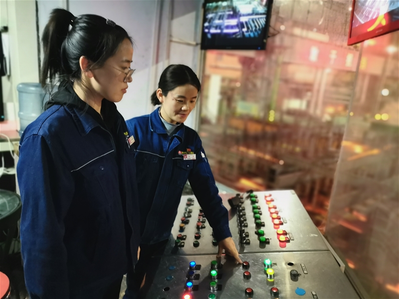 推鋼這項工作,操作人員必須保持精神高度集中,每一根鋼坯的輸送都要看準時間,稍有疏忽,就會造成生產(chǎn)中斷。因此,操作中,她們總是一絲不茍,嚴格按照《推鋼工點檢標準》和《推鋼工日常點檢運行表》執(zhí)行標準化操作,多年的操作,使她們個個練就了高超的水平,面對操作臺上密密麻麻、紅綠各異的操作按鈕,她們?nèi)崦赖氖种甘炀毜仫w舞著,就如彈鋼琴般,推鋼室外一根根火紅的鋼坯,在她們的指揮下,五根一排,整齊地排列著,等待天車吊運到冷床上。