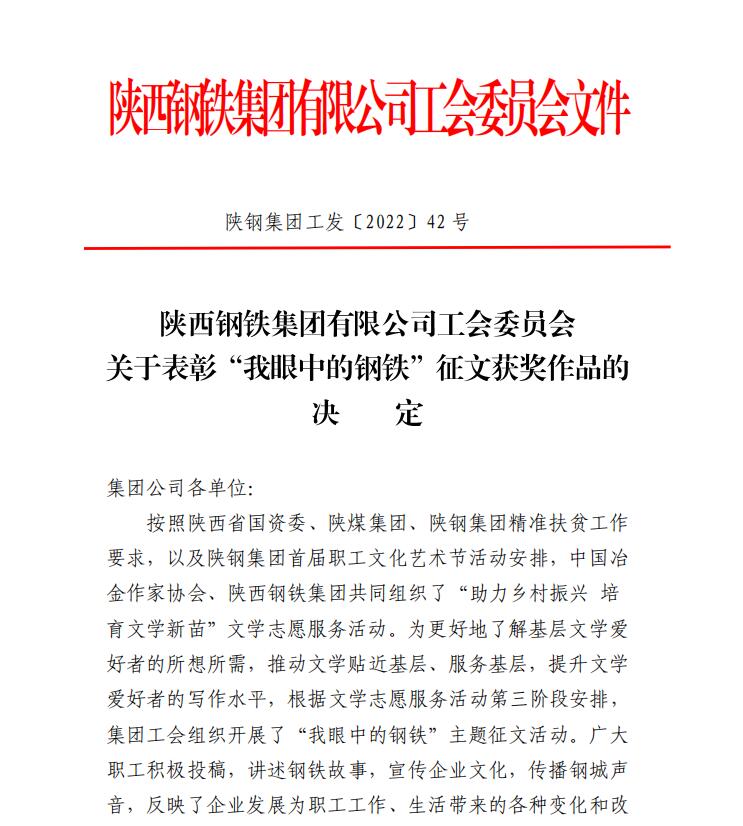 據(jù)悉,此次征文活動是按照陜西省國資委、陜煤集團、陜鋼集團精準(zhǔn)扶貧工作要求,以及中國冶金作家協(xié)會、陜西鋼鐵集團共同組織的“助力鄉(xiāng)村振興 培育文學(xué)新苗”文學(xué)志愿服務(wù)活動第三階段安排,由陜鋼集團工會組織開展的“我眼中的鋼鐵”主題征文活動,旨在更好地了解基層文學(xué)愛好者的所想所需,推動文學(xué)貼近基層、服務(wù)基層,提升文學(xué)愛好者的寫作水平。自活動開展以來,龍鋼公司工會高度重視,廣大職工積極投稿,講述鋼鐵故事,宣傳企業(yè)文化,傳播鋼城聲音,將個人特長融入到公司高質(zhì)量發(fā)展中、融入到本職工作中,為推進陜鋼集團深化改革、建設(shè)高質(zhì)量發(fā)展的現(xiàn)代化鋼鐵強企努力奮斗。