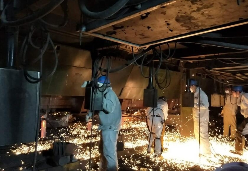 最后一站是攝影記者們向往已久的煉鋼。走進(jìn)煉鋼新區(qū),“打造中國(guó)最具競(jìng)爭(zhēng)力的高端鋼鐵材料服務(wù)商,建成美麗幸福新陜鋼”的巨幅宣傳牌不禁讓人精神一振。當(dāng)走過(guò)爐前的“文化長(zhǎng)廊”后,加廢鋼的斗子懸在轉(zhuǎn)爐上空,操作室內(nèi),爐長(zhǎng)張社寧仔細(xì)地觀察著各個(gè)下料成分、重量的數(shù)字變化,看到我們來(lái)熱情地打招呼。來(lái)到連鑄機(jī)平臺(tái),一名爐前工喊著“讓一下,小心燙”,一邊用厚厚的白手套挑著鋼釬,經(jīng)詢問(wèn)原來(lái)是剛換下來(lái)的中包結(jié)晶器套管。中包工們一字排開(kāi)站立在中包各流口前,操作著中包拉鋼設(shè)備,看著火紅的鋼水聽(tīng)話地流進(jìn)結(jié)晶器口,前邊是鋼水的炙烤,后邊吹風(fēng)機(jī)呼呼地吹著,鐵打的人也會(huì)因?yàn)?小時(shí)的長(zhǎng)時(shí)間站立而困乏顫抖,他們的毅力難以想象。“爐內(nèi)煉鋼,爐外練人”的傳說(shuō)真是再現(xiàn)了這種情景。