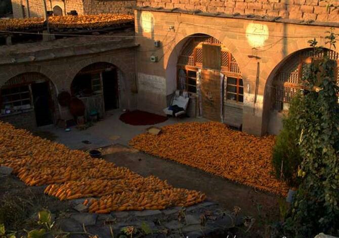 冬日的陜北,山脈連綿寂寥,可裊裊炊煙卻為這廣闊天地添了幾分色彩。天還麻麻亮的時候,陜北的婆姨就開始忙了,堿坂上的碾轱轆悠哉悠哉的轉著。拉碾子的驢走走停停,時而偷吃一嘴玉米面,婆姨罵罵咧咧道:“你這個老家禽,給你喂時你不餡,正讓你干活你就餡歡了,噔俅。”跟著母親的孩子,懷中抱著柴草,燃燒在磨盤旁邊,給母親足夠的亮光。“日上三竿”,人們才懶洋洋的出了窯洞,太陽暖烘烘的照到堿坂上那幾根椽上時,那里就開始熱鬧了。吃過飯的人們來到這里,圪蹴在椽上曬太陽,偶爾有一兩家飯做得遲的,會端上美美一老碗黃米撈飯,來趕個場,也圪蹴下問旁邊的人:“你們吃蘭嚒?沒吃家里多得是,可道我家舀去。”眾人發(fā)出:“你就不會把盆端出來?小氣死啦、光顧你一個人吃哩、端一碗夠誰吃?你也太不實在了……”端飯的人嘿嘿一笑,嘶溜嘶溜的吃起自己的飯。