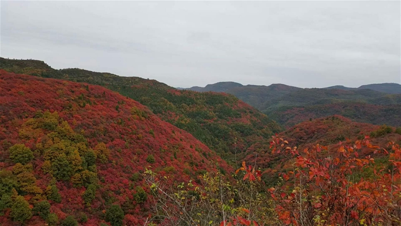 看那連綿起伏的群山,翠服華頂,一撮撮、一窩窩、一片片的紅葉鑲嵌其中,猶如一顆顆紅色寶石,與山體上的蒼松綠柏映襯交錯(cuò),在陽(yáng)光的照射下顯得格外熠熠生輝。亙古沉默的大山在紅葉的點(diǎn)綴下,竟多了幾分羞澀、幾分俊朗、幾分嫵媚。