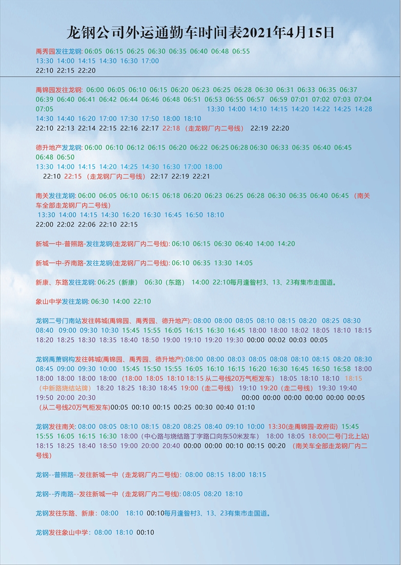 龍鋼公司外運(yùn)通勤車時(shí)間表2021年4月15日